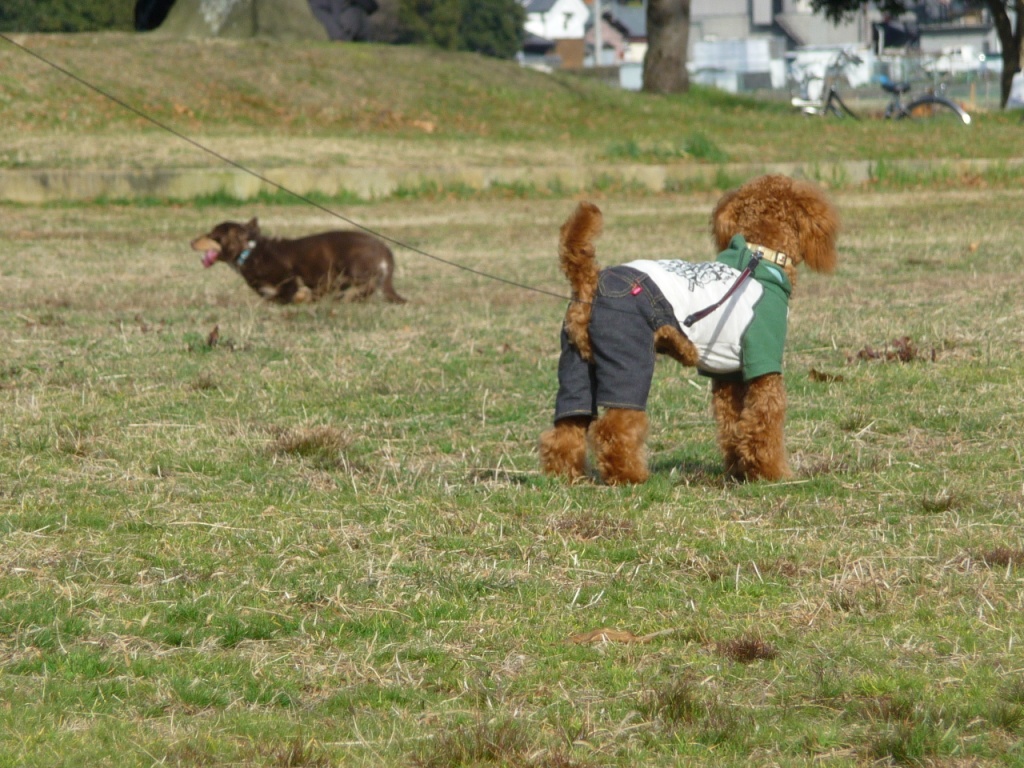 ダックス2匹がノーリードで走り回ってるのがうらやましいようですね。