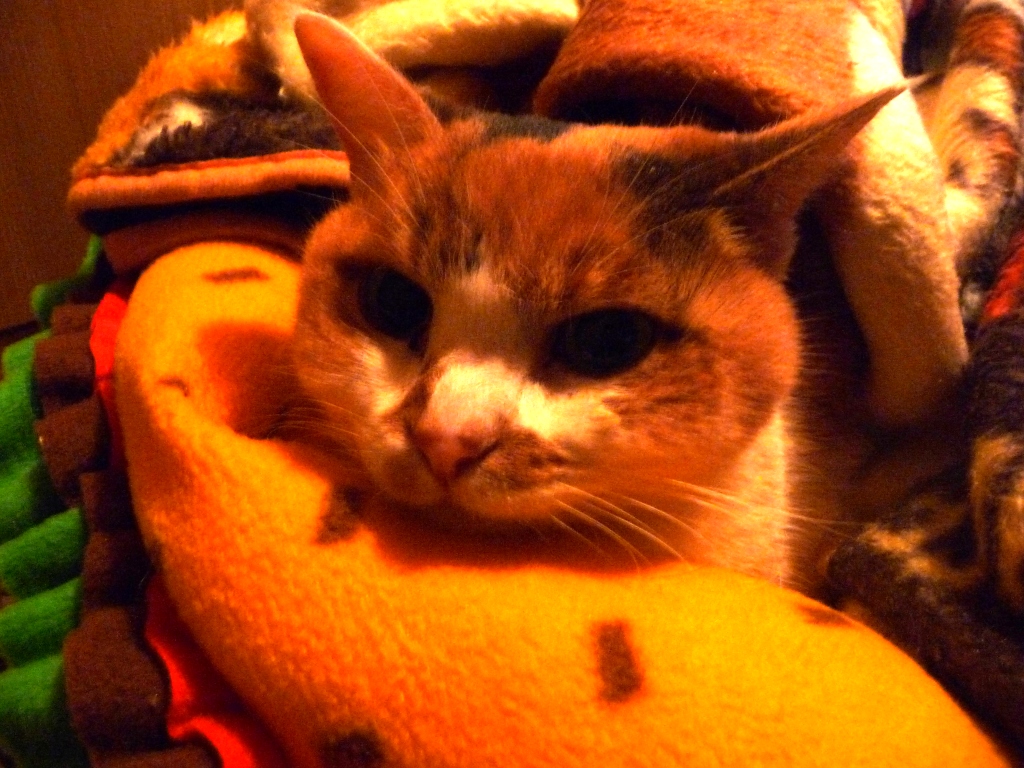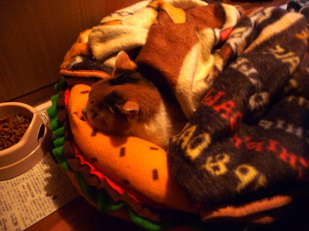 チョコのベットを餌場の横に持ってってチビを入れて、廊下は寒いのでペットボトルにお湯を入れたのと一緒に毛布をかけてます。